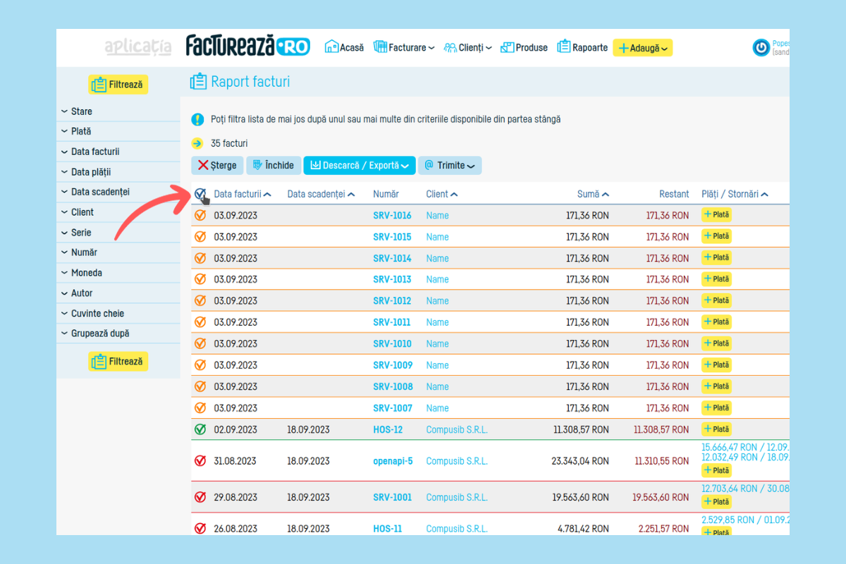 * selectează facturile pe care dorești să le exporți: bifează bulina de lângă Data facturii ca să le selectezi pe toate sau bifează doar bulina din dreptul fiecărei facturi care te interesează