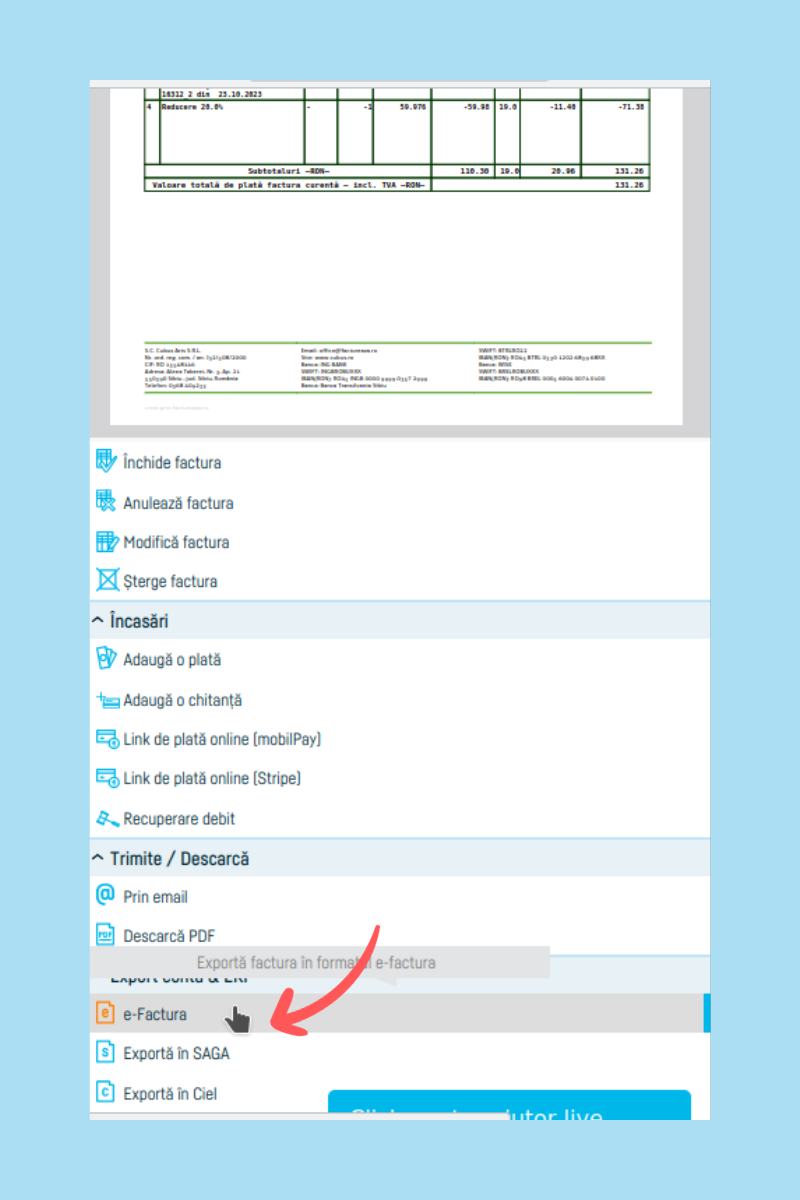 Apoi, din meniul vertical de sub factură, dă click pe submeniul e-Factura.